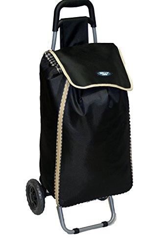 PRODUCT DESCRIPTION Premium Drawstring Shopping Trolley. Colour ; Black / Cream Weight: 1.7 kg Waterproof Bag/ Expanding By Zips Giving an Extra 25% Capacity. Steel Frame With Plastic Grab Handle Push Fit Durable Rubber Wheels. Folds Flat Zipped Pocket On Back Of Bag. Size/ Length: Height 96cms x Width 34cms x Depth 25cms